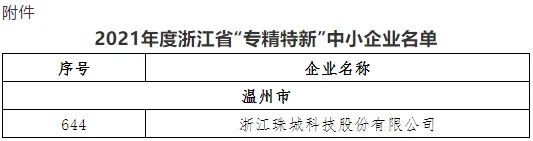近日,浙江省經(jīng)濟(jì)和信息化廳發(fā)布了《浙江省經(jīng)濟(jì)和信息化廳關(guān)于公布2021年度浙江省“專精特新”中小企業(yè)名單的通知》,浙江珠城科技有限公司成功通過(guò)遴選,被認(rèn)定為2021年度浙江省“專精特新”中小企業(yè)。